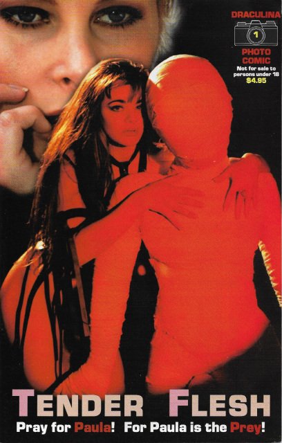LIMITED SUPPIES! $10Draculina Photo Comic 1: Tender Flesh: (1997) Full color cover, b&w interiors on glossy paper, 48 pages comic size. Draculina Photo Comics takes actual photos from the movie, adds text and recreates the entire movie in comic book form with actual photos. Each issue covers a different movie. This issue covers the Jess Franco movie TENDER FLESH starring Amber Newman, Monique Parent, Lina Romay, Aldo Sambrell, Alain Petit. An exotic dancer (Amber Newman) is hired to perform for a wealthy couple on an island. And this takes for a turn for the worse when she is hunted by the couple on the island as the prey and DINNER! $7