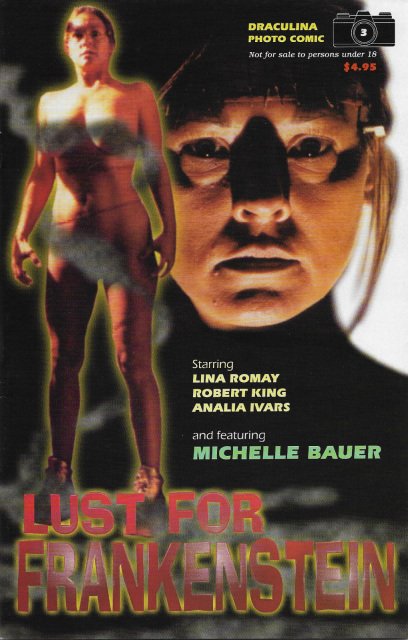 Draculina Photo Comic 3: Lust for Frankenstein: (1999) Full color cover, b&w interiors on glossy paper, 48 pages comic size. Draculina Photo Comics takes actual photos from the movie, adds text and recreates the entire movie in comic book form with actual photos. Each issue covers a different movie. This issue covers Jess Franco's LUST FOR FRANKENSTEIN: Moira Frankenstein, daughter of the Frankenstein in Mary Shelley's story, receives a visitation from her dead father instructor her to revive his creation. She does, and the newly reanimated monster, ... Goddess, becomes a hulking, attractive female who constantly demands sex from her master. When Goddess finds that Moira carries on affairs with a number of women, her jealousy soon causes a violent rampage in which she attempts to destroy all of Moira's lovers. Starring Michelle Bauer. $7